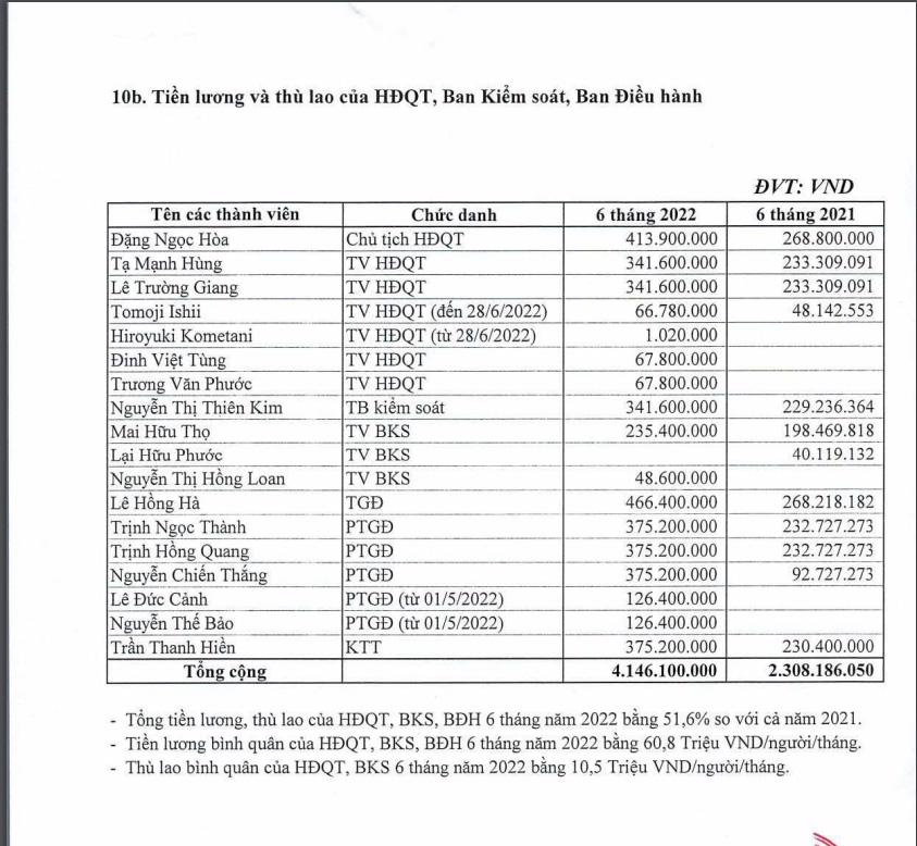 Bà Nguyễn Thị Thiên Kim- Trưởng Ban Kiểm soát nhận lương, thù lao 341 triệu đồng trong 6 tháng đầu năm, tức trung bình gần 57 triệu đồng/tháng; Kế toán trưởng Trần Thanh Hiền và 3 Phó Tổng giám đốc là ông Trịnh Ngọc Thành, ông Trịnh Hồng Quang và ông Nguyễn Chiến Thắng nhận 375 triệu đồng.