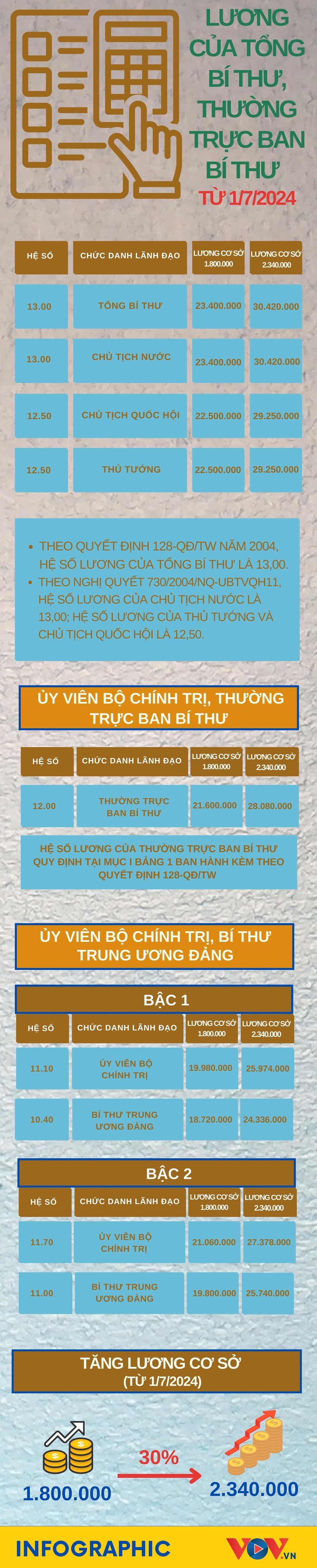 Từ 1/7, lương cơ sở ở mức 2,34 triệu đồng/tháng, lương của Tổng Bí thư, Chủ tịch nước, Chủ tịch Quốc hội, Thủ tướng và nhiều chức danh lãnh đạo sẽ tăng tương ứng 30% theo quy định.