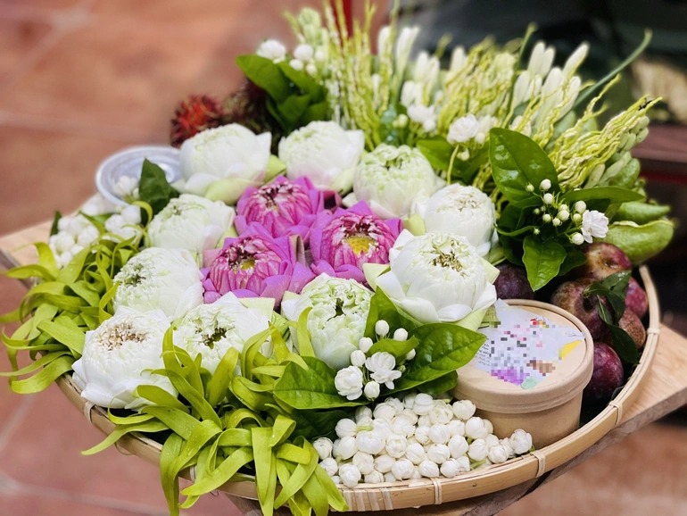 “Nếu mình tự đi mua thì tốn rất nhiều thời gian mà có khi còn không đủ các loại hoa, quả mình cần. Vậy nên, tôi đặt luôn mâm lễ 200 nghìn đồng có cả mận, vải, hoa ngọc lan, hoa sen, bánh gio, cốm, rượu nếp, trầu cau…”, chị Thảo cho biết trên Dân Việt.