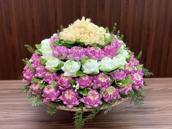 Cụ thể, mẹt hoa lễ có giá 320 nghìn đồng sẽ gồm 3 bông sen quan âm gấp cánh nghệ thuật, 15 bông hoa ngọc lan, 10 bông hoa hoàng lan, 10 bông hoa bạch thiên hương hoặc cúc mai trắng, 3 lá trầu, 2 nhành hoa cau, 2-3 bông mẫu đơn sắp trong mẹt tre cao cấp 20cm.