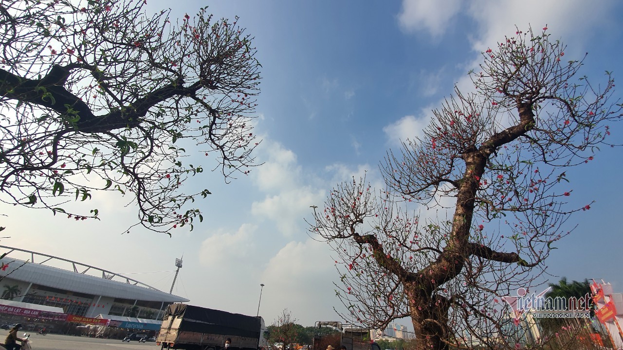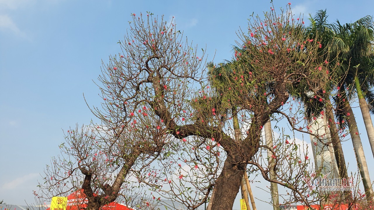 Hai cây đào đặt cạnh nhau ngay tại Trung tâm chợ Hoa xuân, đối diện SVĐ Mỹ Đình có chiều cao tới trên 4m, tán cây xòe rộng chừng 2m.