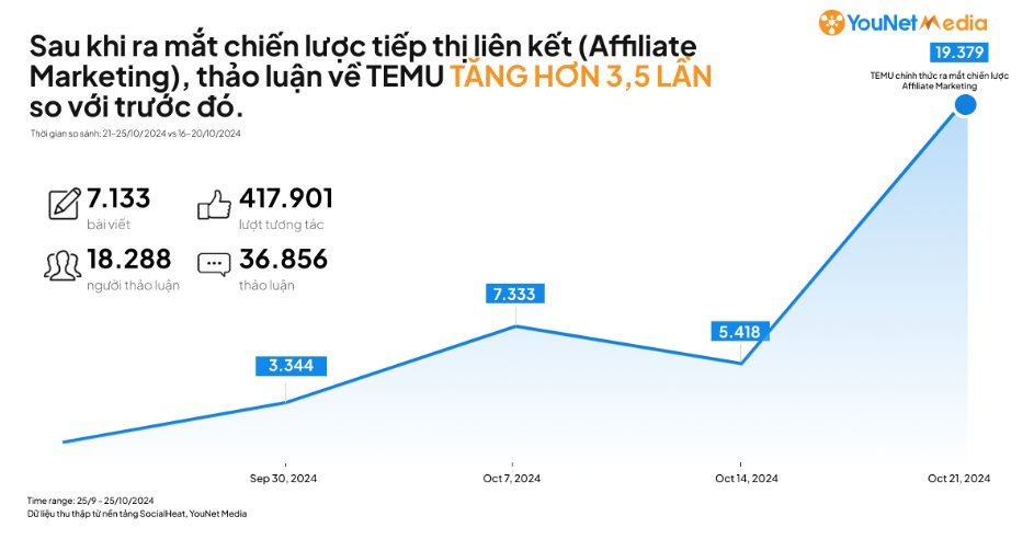 Đặc biệt, vào ngày 22/10, Temu gây chú ý khi tung ra chương trình tiếp thị liên kết (Affiliate Marketing) cho người dùng tại Việt Nam, mở ra cơ hội mới cho các nhà sáng tạo nội dung và người bán hàng kiếm thêm thu nhập. Sự kiện này đã khiến lượng thảo luận về Temu tăng vọt hơn 400% , ghi nhận mức trung bình 51.300 tương tác và 4.500 thảo luận mỗi ngày trong ba ngày từ 22 đến 24/10.