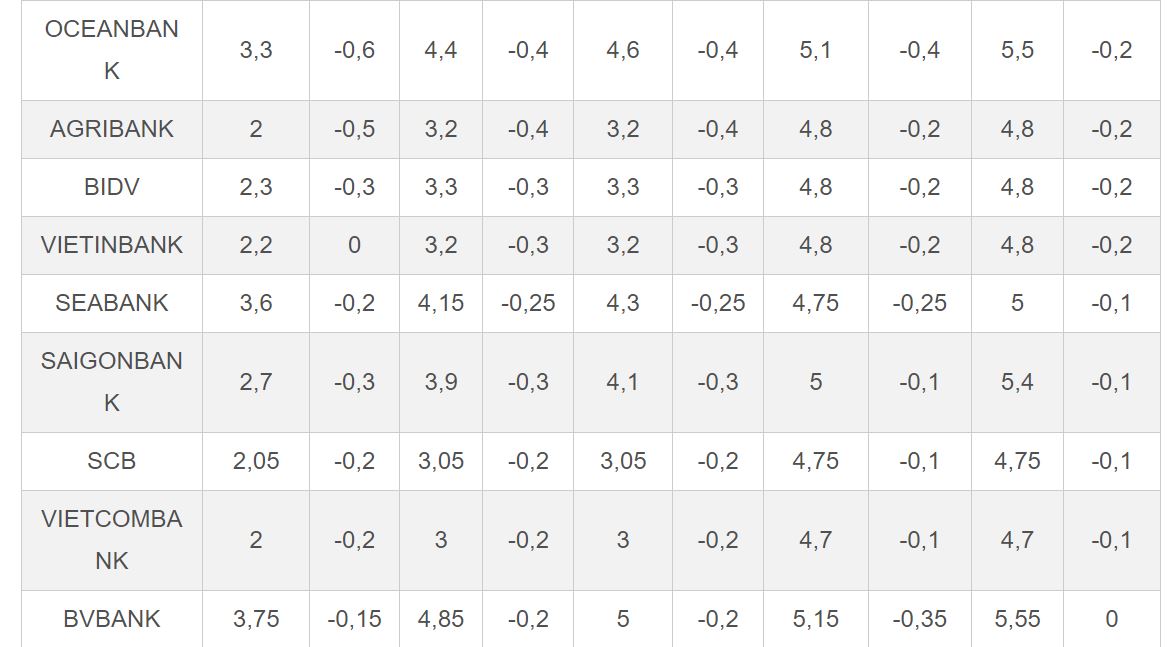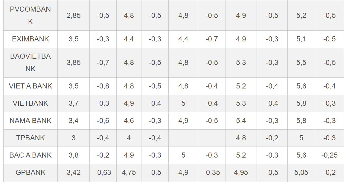 Trong đó, OCB, GPBank, SHB, VIB, Bac A Bank, VPBank, VietBank, TPBank, BaoViet Bank, PVCombank, Nam A Bank, VietinBank, BIDV, Agribank có 2 lần giảm lãi suất.