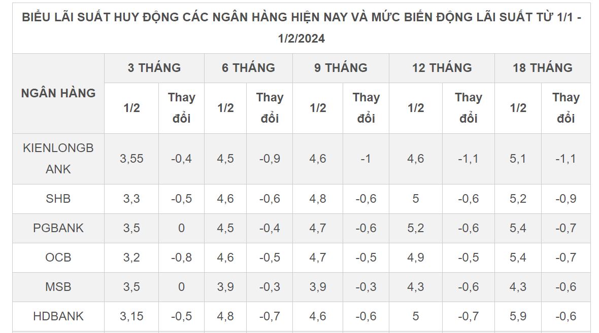 Đầu tháng 1/2024, 10 ngân hàng duy trì lãi suất từ 6-6,5%/năm cho tiền gửi kỳ hạn 18 tháng. Đến cuối tháng, chỉ còn duy nhất SHB duy trì mức lãi suất 6%/năm kỳ hạn này. Đây là minh chứng rõ nét nhất cho thấy các ngân hàng mạnh tay hạ lãi suất huy động.