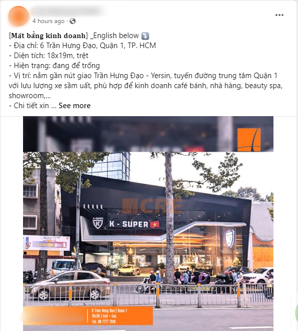 Đáng nói, chỉ vài ngày sau khi "trùm siêu xe" bị bắt giữ, trên fanpage C.R.E. - một công ty về bất động sản đã đăng tải thông tin cho thuê lại mặt bằng tại số 6 Trần Hưng Đạo, Quận 1, TPHCM - là địa chỉ showroom K-Super của Phan Công Khanh.