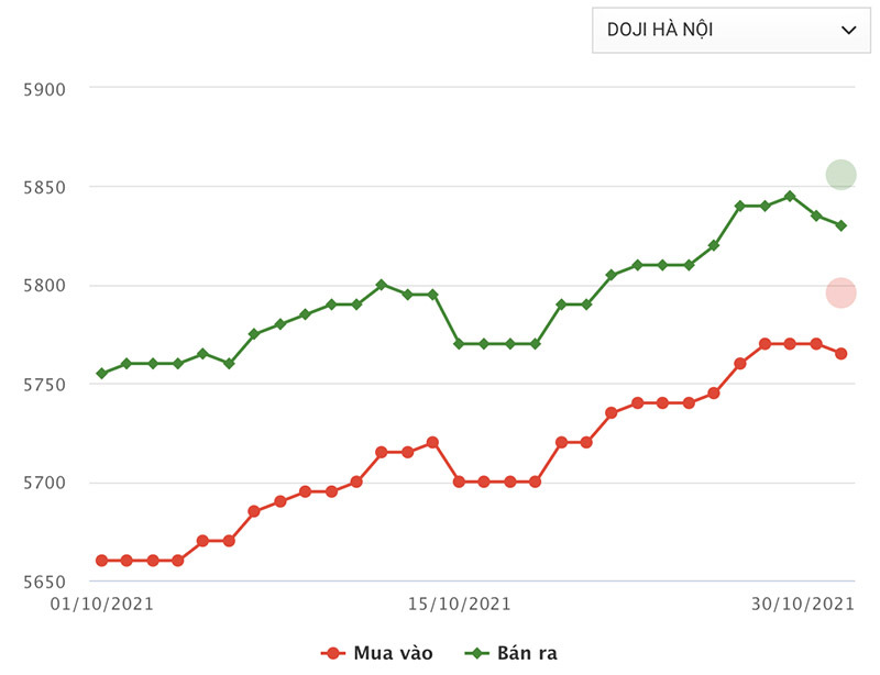 Tính chung cả tuần, giá vàng tăng 200 nghìn đồng/lượng; trong đó, thời điểm giá vàng trong nước lên mức cao nhất là 58,7 triệu đồng/lượng, chênh lệch khoảng 8,5 triệu đồng/lượng so với giá vàng thế giới trong phiên giao dịch sáng 28/10.
