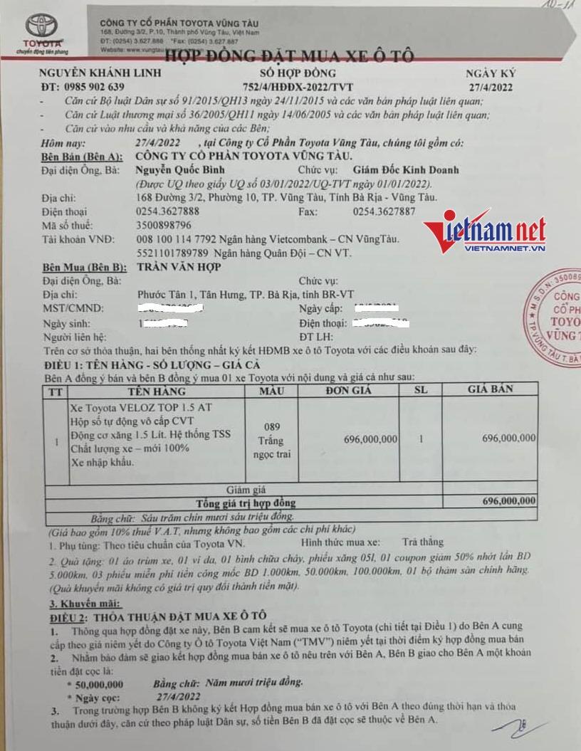 Cụ thể, theo Hợp đồng đặt mua xe của anh Hợp, ở Điều 1- Tên hàng, số lượng, giá cả đã nêu rõ: "Bên A (Toyota Vũng Tàu) đồng ý bán và Bên B (anh Hợp) đồng ý mua 1 Toyota với nội dung và giá cả như sau". Theo đó, bảng giá chi tiết thuộc Điêu 1 thể hiện là mua xe Toyota Veloz, đơn giá là 696 triệu đồng.