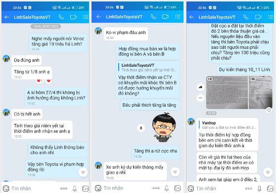 Theo nội dung giao dịch nhắn tin giữa anh Hợp và nhân viên bán hàng Khánh Linh của Toyota Vũng Tàu, vì khách này được giải thích rằng, tại thời điểm bán hàng, bên đại lý chỉ cam kết về thời điểm giao hàng. Còn về giá thì phải theo giá nhà máy tại thời điểm xe về đại lý.