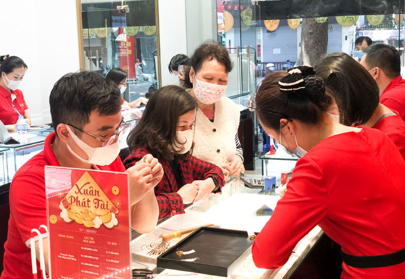Tại các cửa hàng vàng trên phố Hà Nội, lượng người đến mua vàng vào ngày mùng 9 tháng Giêng Âm lịch khá đông. Tuy nhiên, không có cảnh phải xếp hàng, chen chân nhau mua vàng như những năm trước.