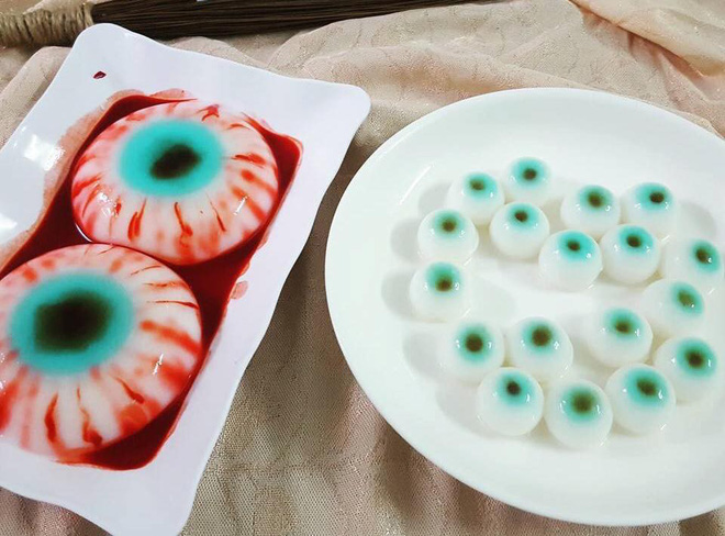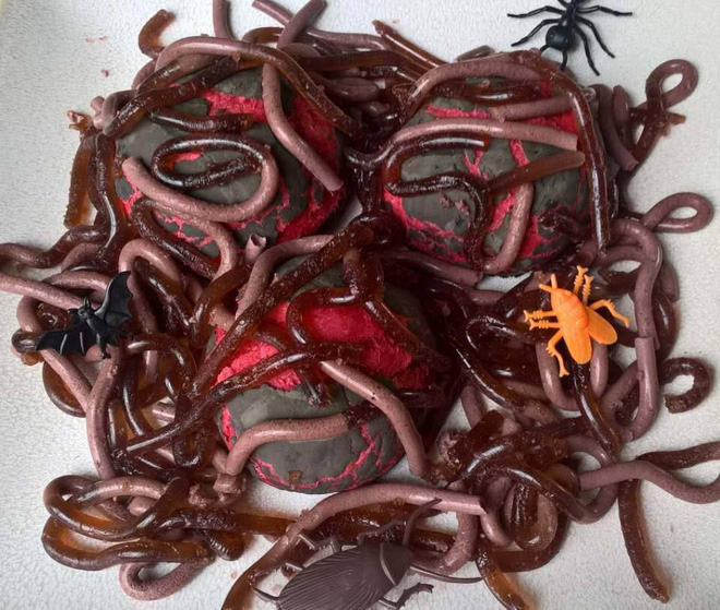 Bên cạnh những mặt hàng hóa trang được nhiều người quan tâm thì những loại bánh có hình thù kinh dị như mô phỏng não người, ngón tay chảy máu, sâu nhện, côn trùng cũng được rao bán nhiều với đủ loại mẫu mã, đa dạng hơn so với năm trước.