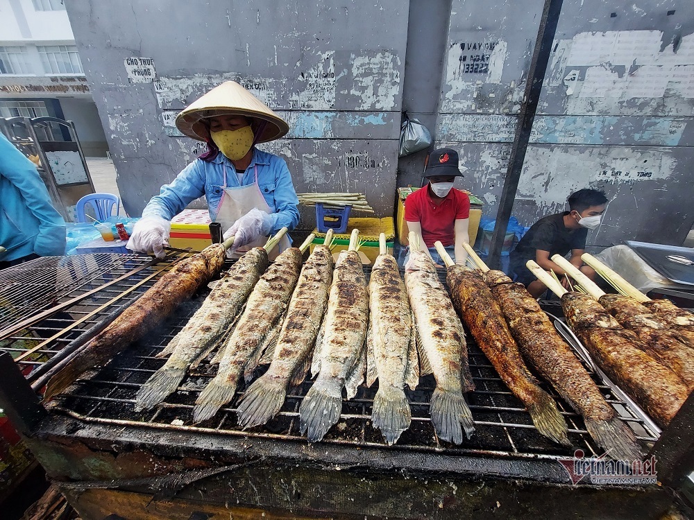 Để kịp phục vụ khách mua cá nướng về cúng, bà chủ phải thuê khoảng 100 nhân viên phục vụ làm cá cũng như nướng cá. 10 bếp than hồng, mỗi bếp 10 con một lúc, nướng liên tục mới đáp ứng được nhu cầu của khách.