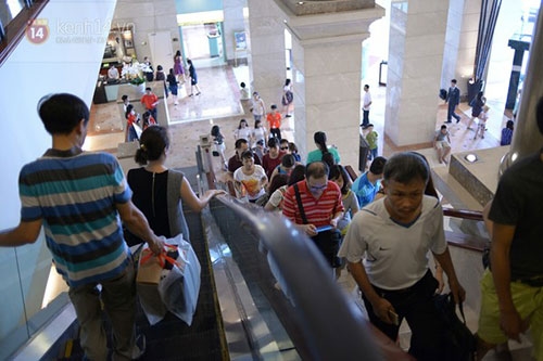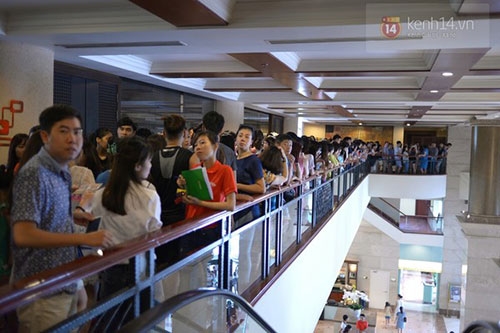 Khoảng 9h30, hệ thống thang cuốn của khách sạn đã tạm dừng, dòng người xếp hàng dài chờ đợi. |