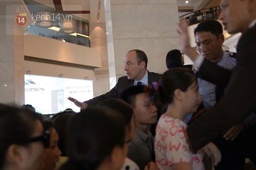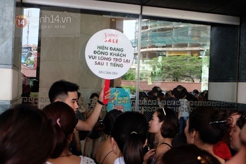 Quản lý khách sạn liên tục phải ra ký hiệu để khách hàng bình tĩnh, không chen lấn, xô đẩy khi vào mua hang. |