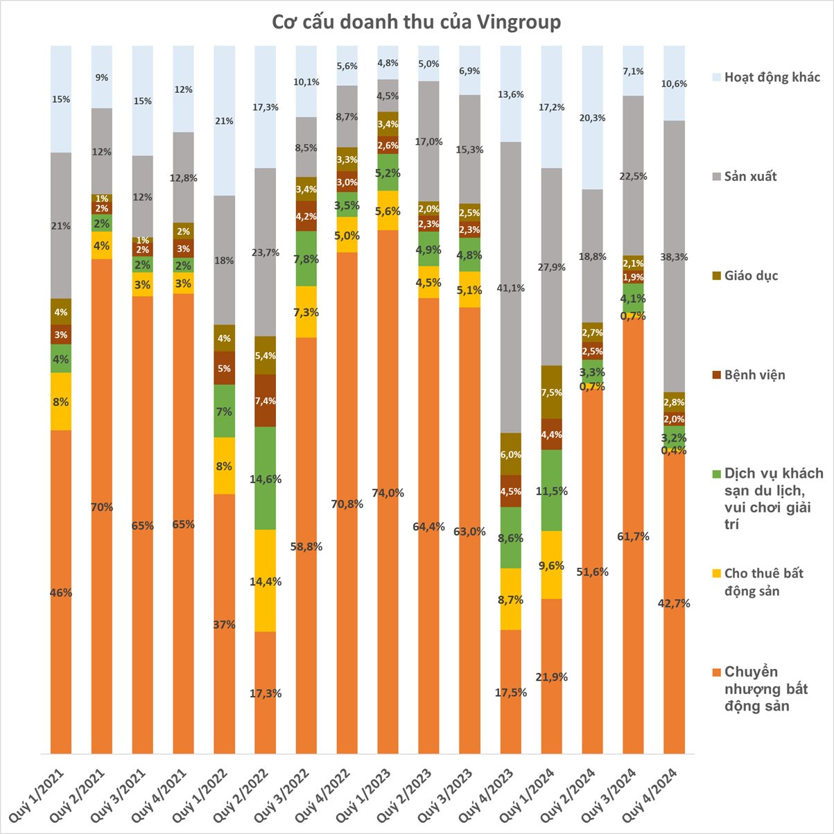 Tính riêng quý 4/2024, doanh thu từ mảng sản xuất lên tới gần 25.000 tỷ đồng, cao gấp gần 2 lần so với quý 3/2024. Nhờ đó, tỷ trọng đóng góp của mảng sản xuất chiếm 38,3% tổng doanh thu của Vingroup, ngang ngửa với mảng chuyển nhượng bất động sản là 42,7%.