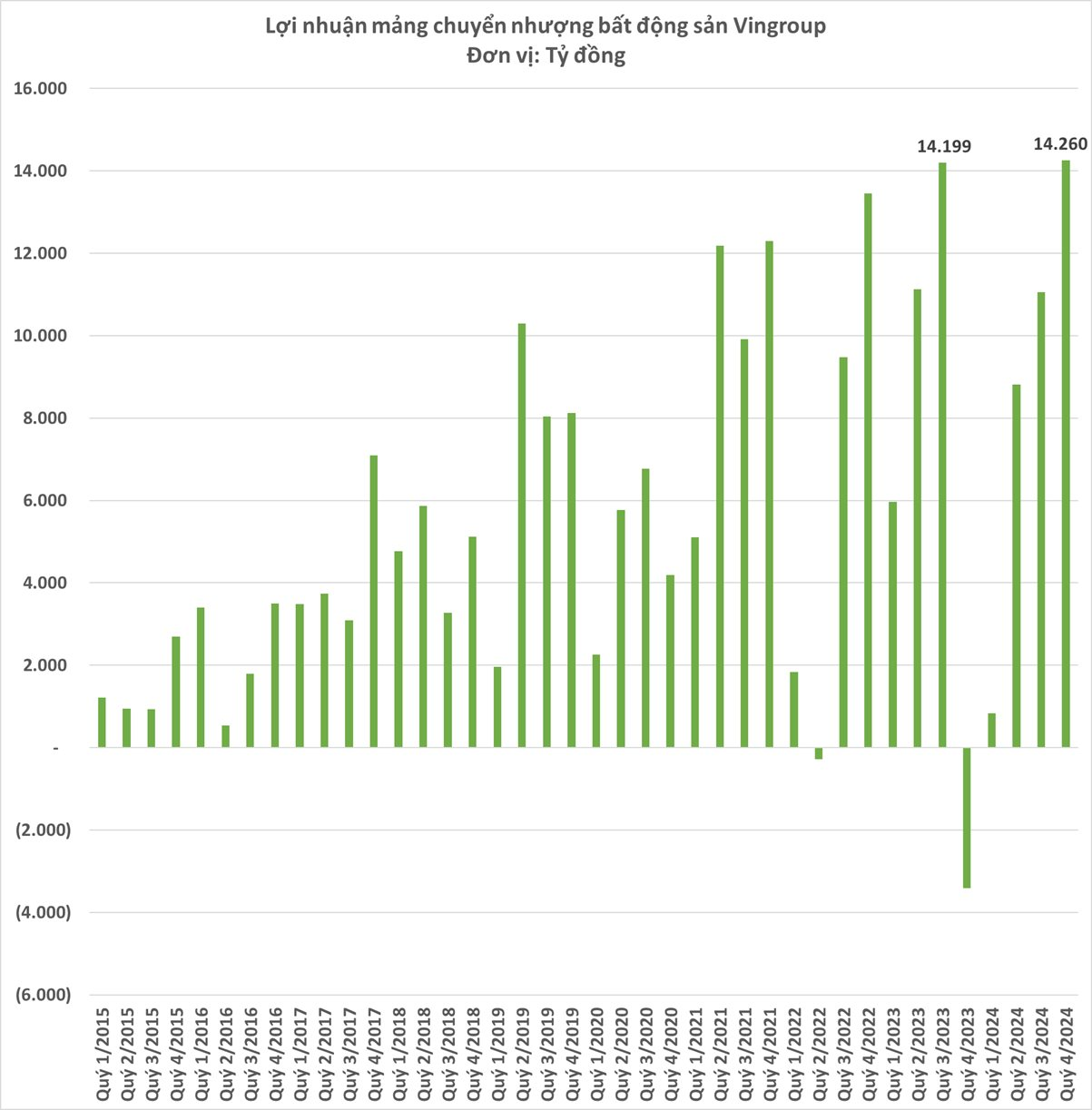 Đáng chú ý, lợi nhuận từ mảng chuyển nhượng bất động sản của Vingroup quý 4/2024 vừa qua lên tới 14.260 tỷ đồng, cũng vượt qua kỷ lục của quý 3/2023.