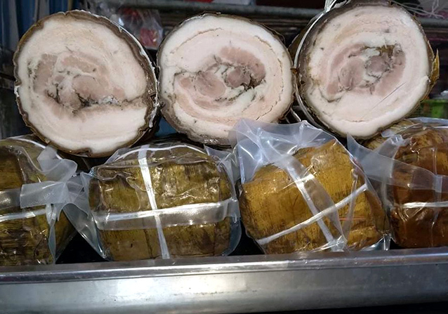 “Hôm đó trong mâm cơm, mình thấy gia đình mang ra khoanh giò lạ mắt được gói bằng thịt ba chỉ quấn lá chuối thơm. Nhìn bên ngoài, thấy giống hệt thịt trong bánh chưng mà Tết nhà mình hay gói. Khi ăn thơm đậm đà mùi thịt, mùi hạt tiêu. Mình rất ấn tượng vì món giò này lạ miệng quá. Hỏi ra thì được biết đây là giò nây”, chị nói.