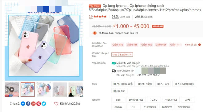 Ốp có giá từ 1.000 - 5.000 đồng tùy màu sắc và tùy từng loại iPhone, từ iPhone 5 cho đến iPhone 12. Hiện, chiếc ốp có hơn 275 nghìn lượt mua và 58,6 nghìn đánh giá.