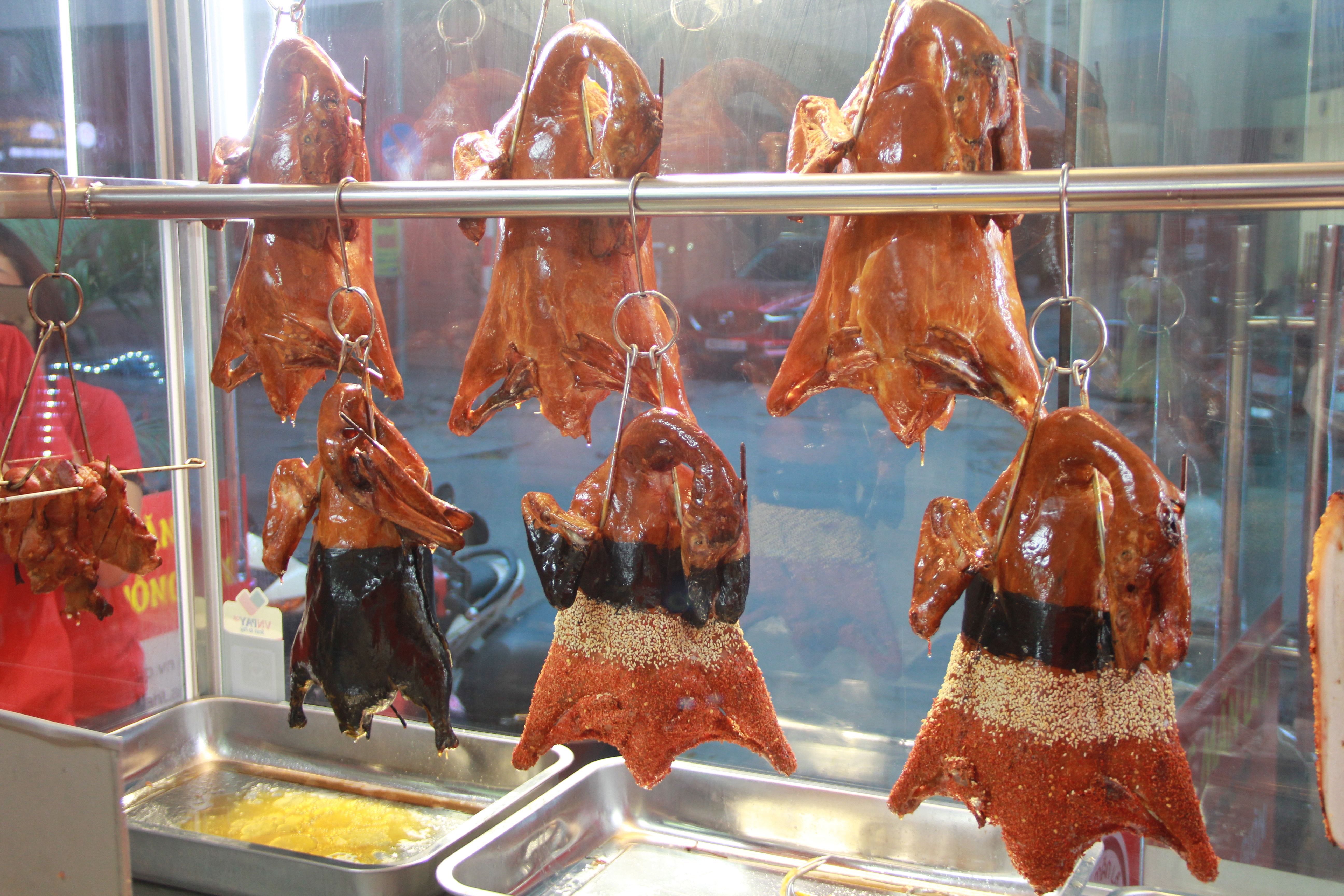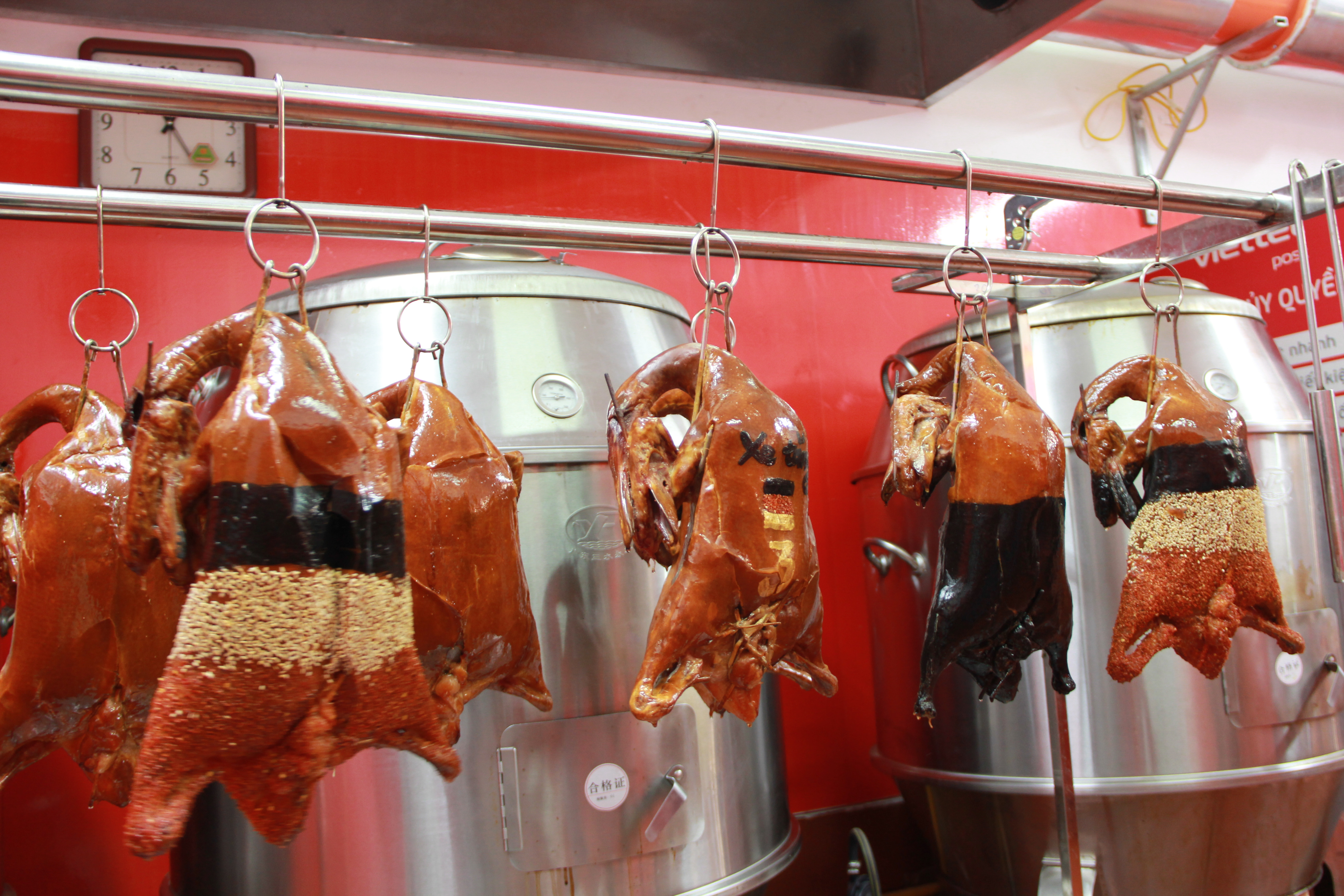 Xong xuôi, vịt được quay trong lò chuyên dụng từ 1-2 tiếng. Khi vịt chín, người ta quét thêm lớp dầu thơm để tạo độ bóng và giữ cho phần da giòn lâu hơn.