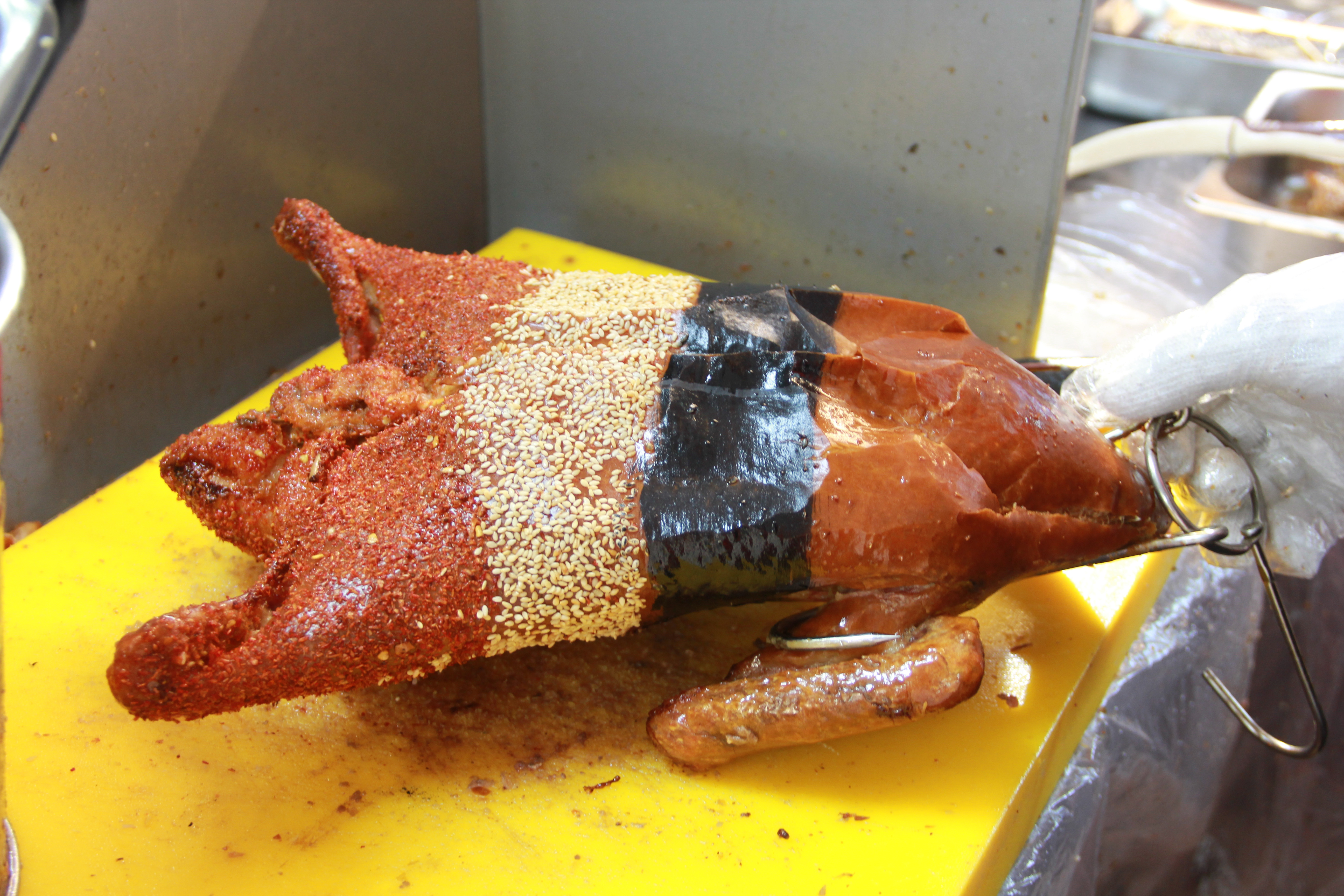 Điểm nhấn của món vịt nướng này là lớp da “giòn sần sật” và hình thức độc đáo. Mỗi con vịt đều được tạo tư thế đẹp mắt như đang đứng, ưỡn ngực về phía trước đầy oai phong, mạnh mẽ.