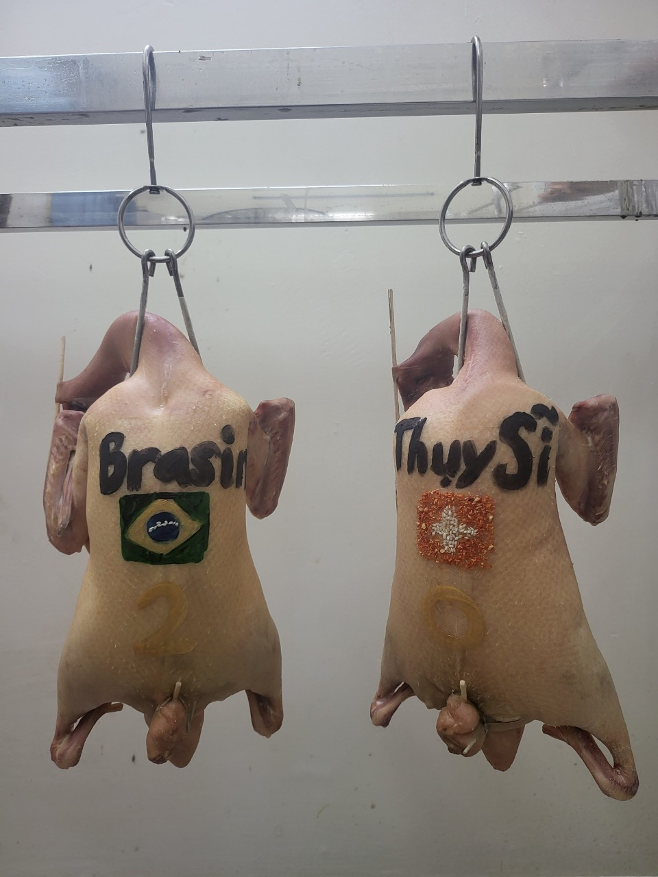 Chủ quán cũng sử dụng các nguyên liệu tự nhiên như tinh bột than tre, kem, vừng (mè), bột ớt để vẽ tên, quốc kỳ đội tuyển hay dự đoán tỉ số các trận đấu lên phần thân vịt và thực khách có thể thưởng thức luôn.