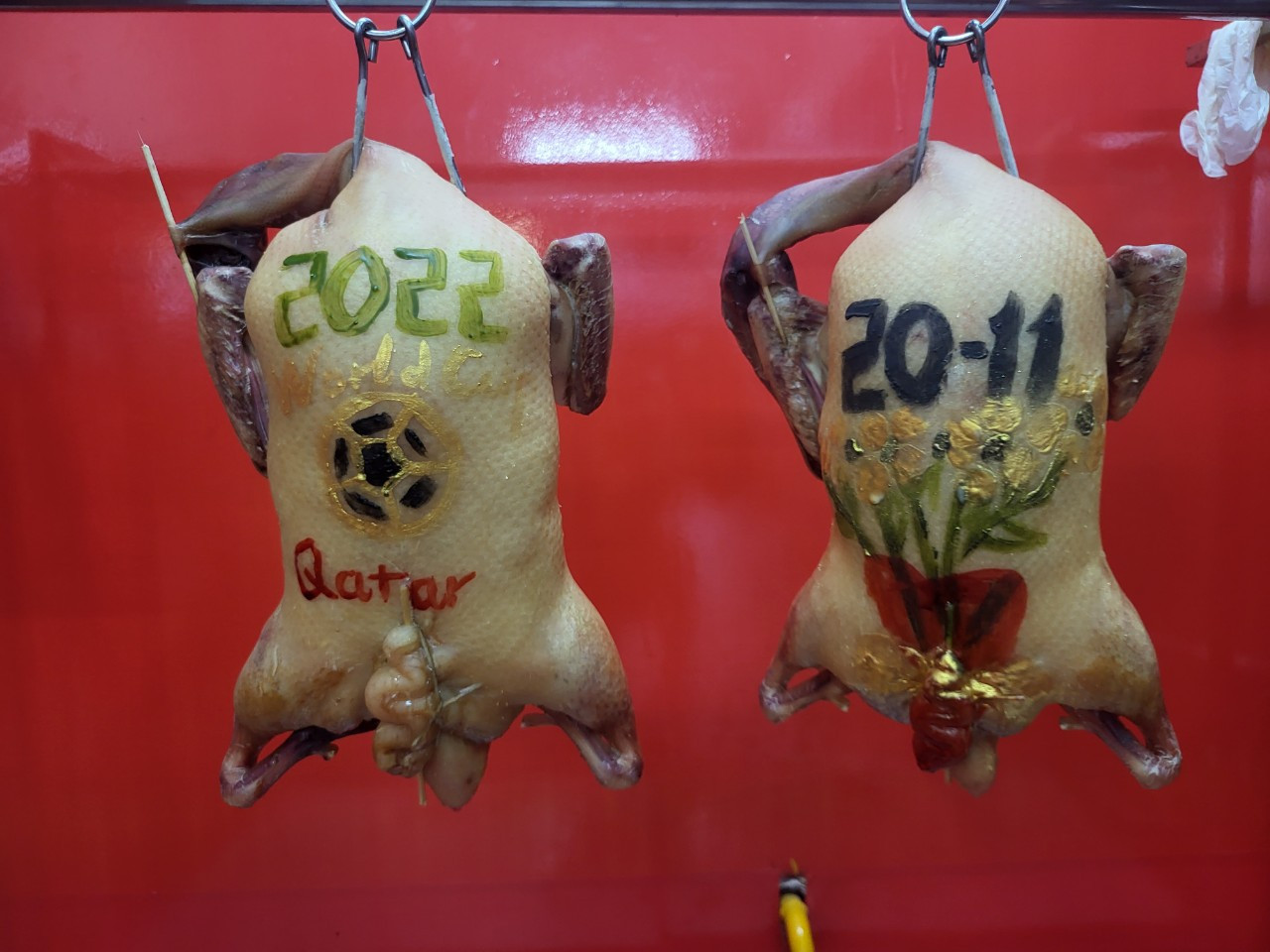 Đặc biệt, món vịt nướng tại quán còn trở nên độc đáo nhờ các họa tiết trang trí “ăn theo” sự kiện bóng đá lớn nhất hành tinh – World Cup 2022.