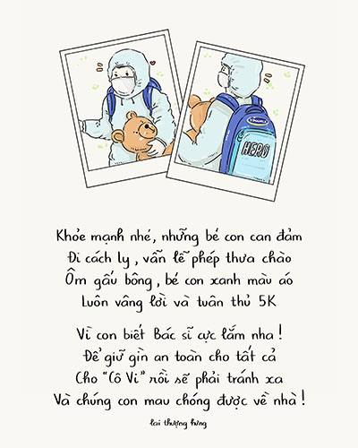 Nguồn cảm hứng sáng tác của Lai Thượng Hưng còn đến từ câu chuyện có thật của nhiều em nhỏ dũng cảm đi cách ly một mình. Những hình ảnh xúc động ấy càng gợi nhắc chúng ta về sự quan trọng của việc phải giữ gìn sức khỏe cho bản thân, người xung quanh và cộng đồng. Để một ngày không xa, các bạn nhỏ có thể sớm trở lại cuộc sống bình thường, được tiếp tục lớn lên trong sự bình yên và vòng tay yêu thương của cha mẹ.