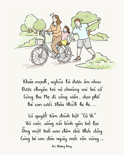 Bộ tranh không chỉ là suy nghĩ của trẻ em, mà còn là câu chuyện của các cá nhân, gia đình Việt trong những ngày kiên cường chống dịch. Bên cạnh việc chủ động giữ sức khỏe cho gia đình thì việc lan tỏa lối sống khỏe mạnh và năng lượng tích cực đến những người xung quanh và cộng đồng lại càng ý nghĩa hơn vì “Mỗi người khỏe mạnh sẽ tạo nên cộng đồng khỏe mạnh, Việt Nam khỏe mạnh”.