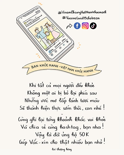 Với mỗi bài đăng chia sẻ về thói quen, lối sống lành mạnh giúp bảo vệ, nâng cao sức khỏe thể chất và tinh thần trên Facebook, Instagram, Tiktok ở chế độ công khai, cùng 2 hashtag #VinamilkcungVietNamkhoemanh, #VaccineCovid19chotreem, Vinamilk sẽ đóng góp 50.000 đồng hỗ trợ vaccine cho trẻ em 12-18 tuổi. Tổng ngân sách Vinamilk cam kết cho hoạt động này là 10 tỷ đồng. Chương trình không giới hạn số bài đăng tham gia của mỗi người.