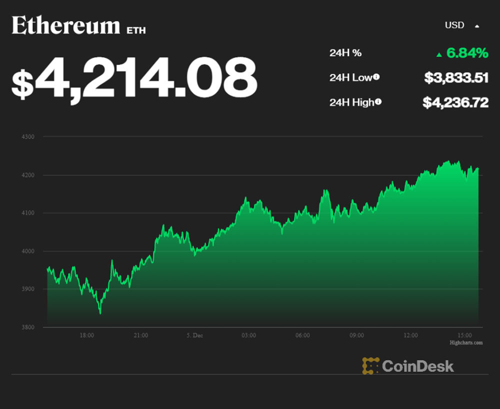 Theo dữ liệu của CoinDesk vào lúc 15h50' ngày 5/12, đồng Ethereum được giao dịch ở mức 4.214,08 USD, tăng 6,48% so với ngày hôm qua. Trong 24 giờ gần nhất, giá Ethereum thời điểm cao nhất đạt 4.236,72 USD, thấp nhất ở mức 3.833,51 USD.