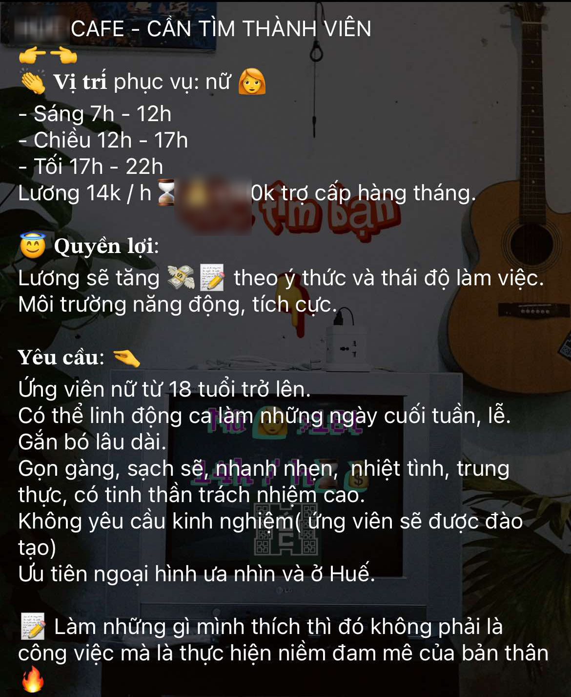 Tuy nhiên cũng không ít những ồn ào xoay quanh chuyện làm thêm và tuyển người làm part time này. Và mới đây, một quán cà phê ở Huế đăng tin tuyển nhân viên nữ, gây nên những trang cãi nảy lửa trên MXH.