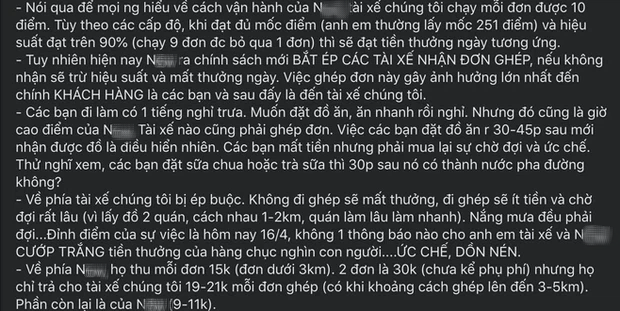 - Về phía tài xế chúng tôi bị ép buộc. Không đi ghép sẽ mất thưởng, đi ghép sẽ ít tiền và chờ đợi rất lâu (vì lấy đồ 2 quán, cách nhau 1-2km, quán làm lâu làm nhanh). Nắng mưa đều phải đợi... Đỉnh điểm của sự việc là hôm 16/4, không một thông báo nào cho anh em tài xế và N. CƯỚP TRẮNG tiền thưởng của hàng chục nghìn con người.... ỨC CHẾ, DỒN NÉN.
