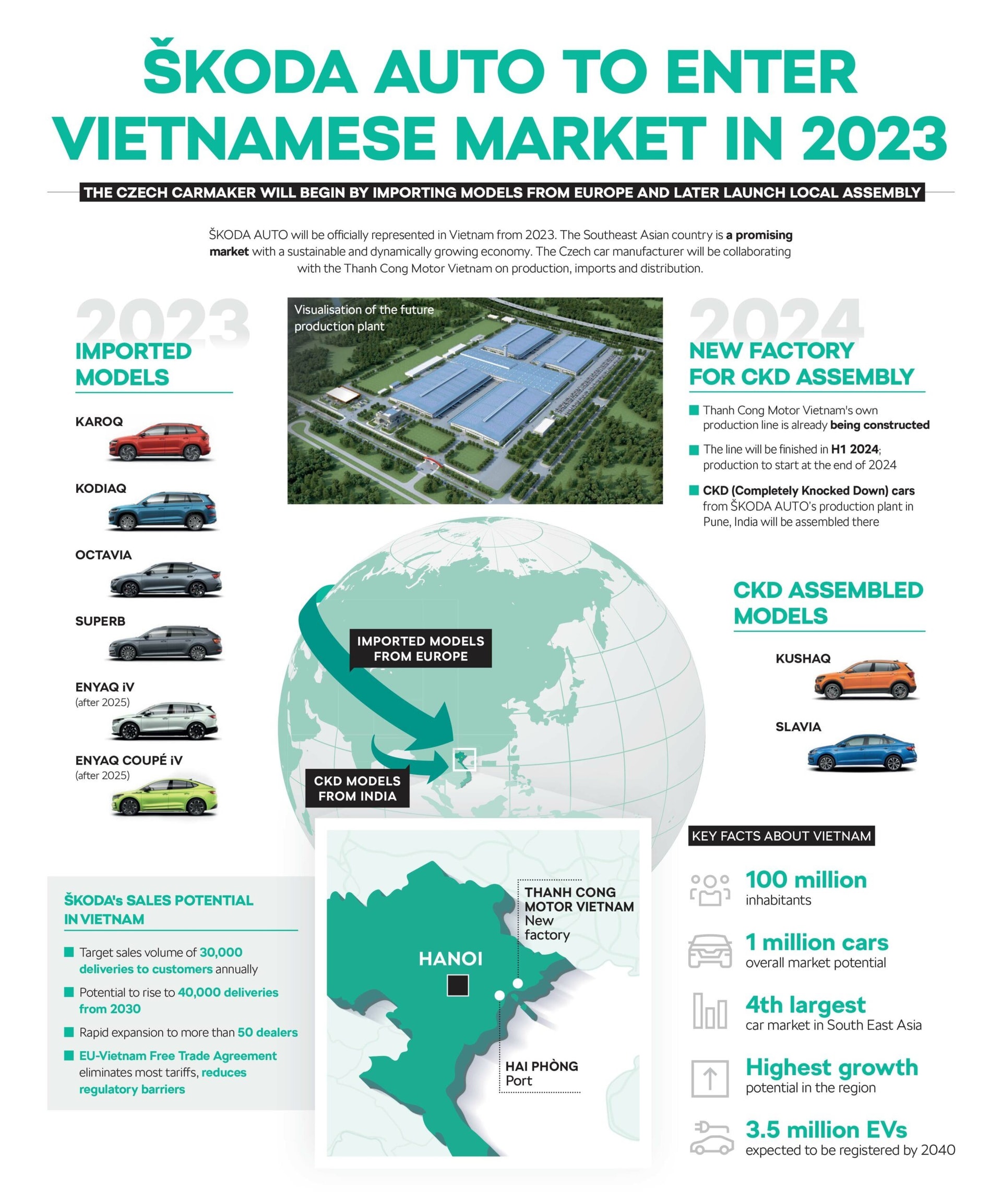 Škoda Auto kỳ vọng sẽ đạt doanh số hàng năm 30.000 ô tô trong giai đoạn đầu và lên tới hơn 40.000 chiếc mỗi năm từ năm 2030, nhờ việc mở rộng mạng lưới phân phối lên hơn 50 đại lý, các cơ sở đầu tiên được đặt tại Hà Nội và TP.HCM.