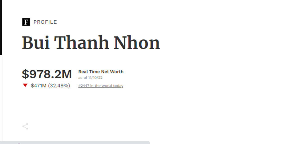 Sáng 14/11, Forbes chính thức không còn cập nhật trực tiếp biến động tài sản của ông Bùi Thành Nhơn, sau khi khối tài sản của ông Nhơn giảm xuống còn 946 triệu USD vào chiều 11/11.
