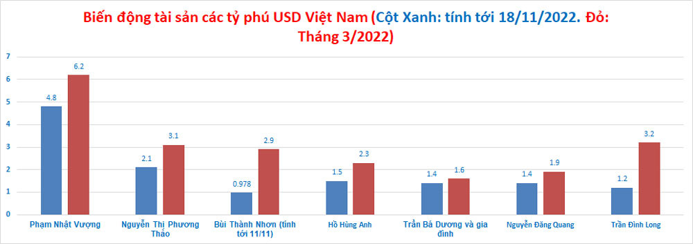 So với hồi tháng 3, tỷ phú Phạm Nhật Vượng mất 2-2,4 tỷ USD, xuống thấp nhất là 3,8 tỷ USD; CEO VietJet Nguyễn Thị Phương Thảo mất 1,1 tỷ USD, xuống còn 2 tỷ USD; Chủ tịch Techcombank Hồ Hùng Anh mất 900 triệu USD, xuống 1,4 tỷ USD; Chủ tịch Masan Nguyễn Đăng Quang ghi nhận tài sản giảm 700 triệu USD, còn 1,2 tỷ USD.