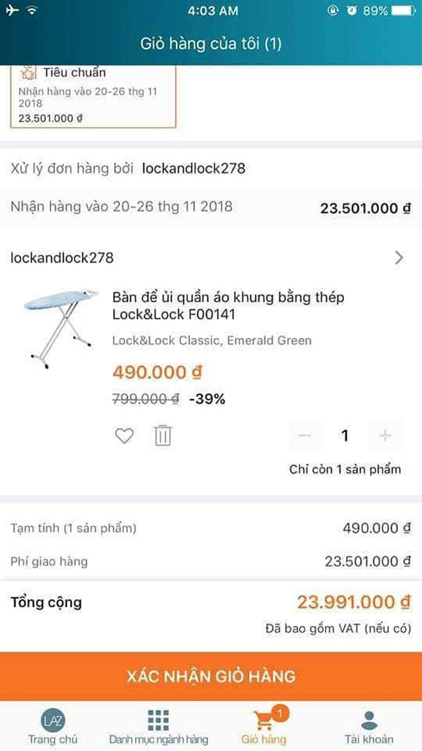 Tương tư như chị Đào, khách hàng Nguyễn Phạm Bảo Hân (TP.HCM) chưa hết hoang mang khi mua sản phẩm “bàn để ủi quần áo khung bằng thép Lock&Lock” với giá 490.000 đồng nhưng phí giao hàng lên tới 23.501.000 đồng, dù nhà cung cấp tại TP.HCM.