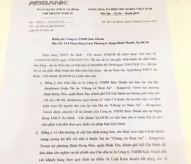 Ông H.T.H., một khách hàng mua căn hộ tại dự án thông tin, tại thời điểm dự án chung cư Kingsway Tower đưa ra thị trường, Ngân hàng An Bình (ABBank) chi nhánh TPHCM đã có công văn số 08/CV-CNHCM3.18 ngày 9/3/2018, đồng ý cho Công ty TNHH Siêu Thành mở bán các căn hộ, shophouse thuộc dự án chung cư Kingsway Tower mà không giải chấp đối với các căn hộ, shophouse thuộc dự án nêu. Điều kiện của phía ABBank là toàn bộ nguồn thu còn lại của dự án được chuyển về tài khoản của Công ty Siêu Thành mở tại ABBank chi nhánh TPHCM, và việc bán nhà ở phải tuân thủ theo quy định của pháp luật.