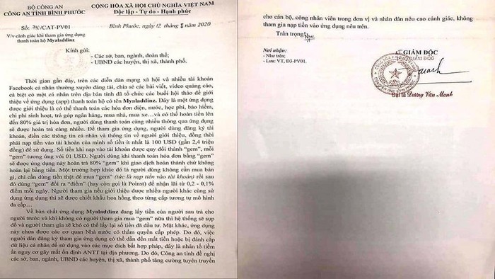 Trong văn bản mới đây, Công an tỉnh Bình Phước cho biết, về bản chất, ứng dụng Myaladdinz đang lấy tiền của người sau trả cho người trước và khi không có người tham gia mua “gem” nữa thì hệ thống sẽ sụp đổ và người tham gia sẽ khó có thể lấy lại số tiền đã đầu tư. Mặt khác, ứng dụng này chưa được cơ quan có thẩm quyền tại Việt Nam cấp phép.