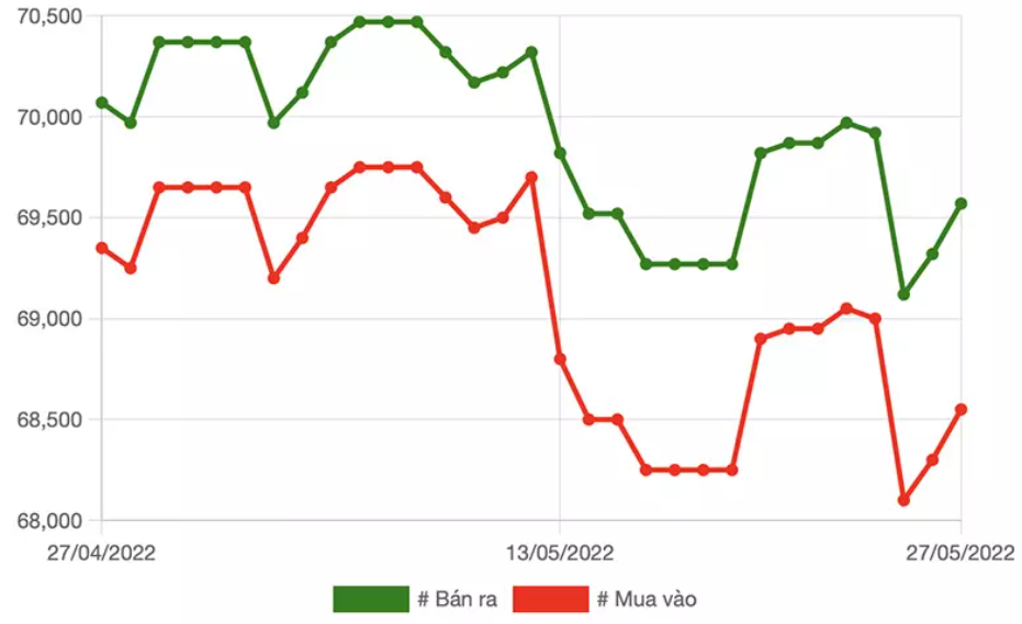Kết thúc phiên giao dịch 27/5, giá vàng miếng 9999 tại SJC Hà Nội là 68,55 triệu đồng/lượng (mua vào)- 69,55 triệu đồng/lượng (bán ra). SJC TP.HCM niêm yết ở mức 68,55 triệu đồng/lượng (mua vào) và 69,57 triệu đồng/lượng (bán ra). Doji Hà Nội niêm yết ở mức 68,5 triệu đồng/lượng (mua vào) và 69,45 triệu đồng/lượng (bán ra). Tại TP.HCM, Doji TP.HCM mua vàng SJC ở mức 68,5 triệu đồng/lượng, bán ra ở mức 69,45 triệu đồng/lượng.