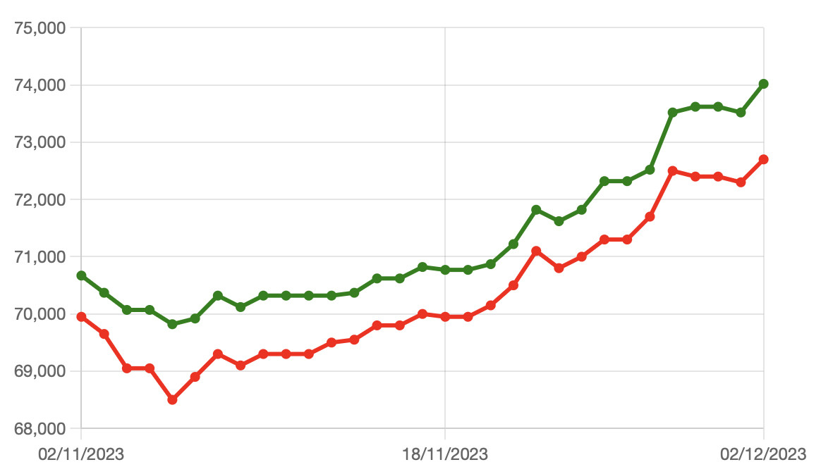 Trong 1 năm qua, kim loại quý có mức tăng đáng kể. Chốt phiên 2/12, giá vàng miếng 9999 tại SJC TP.HCM là 72,7 triệu đồng/lượng (mua vào) và 74 triệu đồng/lượng (bán ra). SJC Hà Nội niêm yết ở mức 72,7 triệu đồng/lượng (mua vào) và 74,02 triệu đồng/lượng (bán ra).