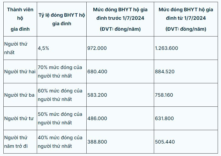 Với mức lương cơ sở mới là 2.340.000 đồng/tháng thì mức đóng BHYT hộ gia đình kể từ ngày 1/7/2024 thay đổi như sau: