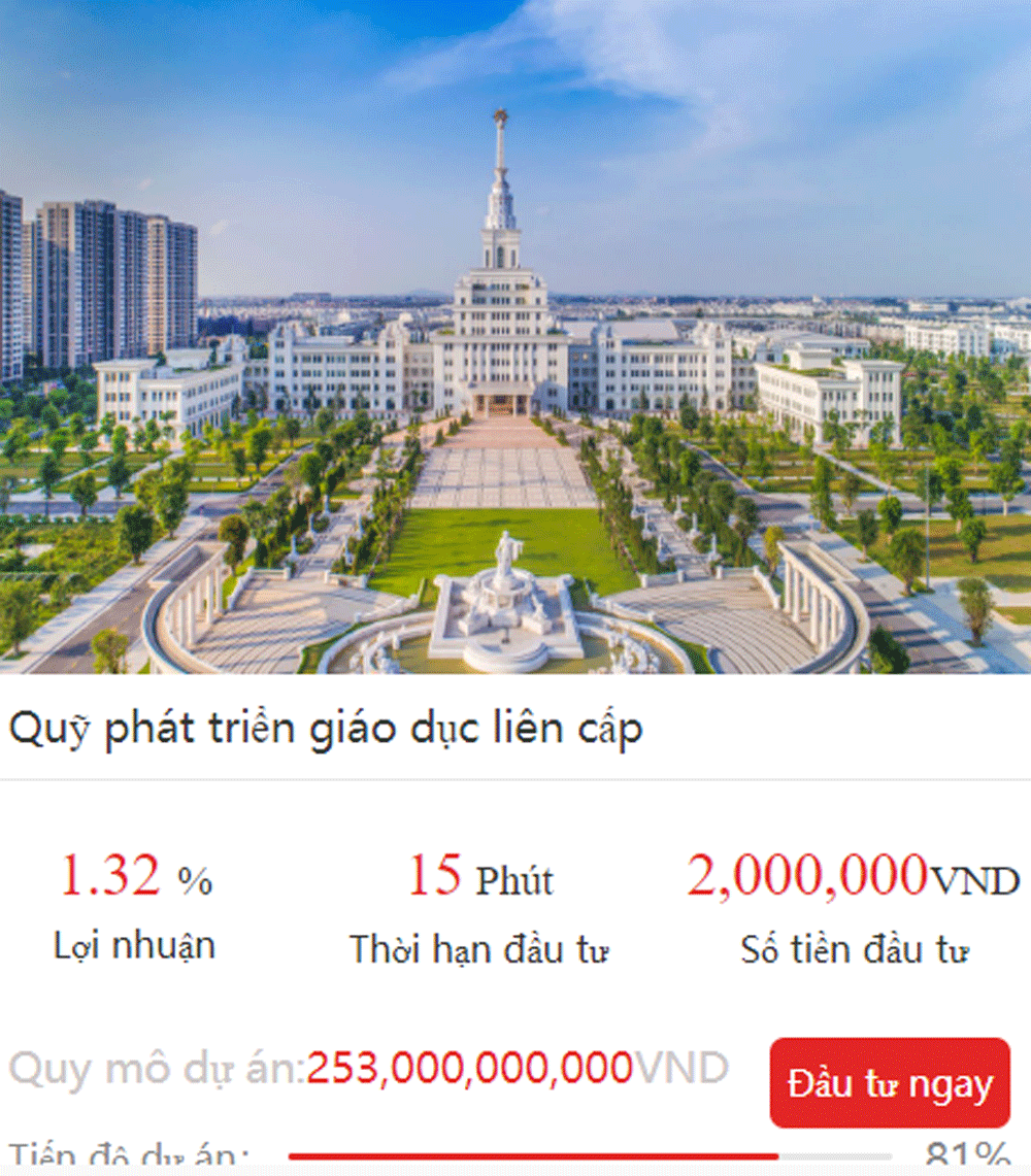 Đối tượng lừa đảo vẽ ra các "quỹ phát triển" thương mại dịch vụ. y tế, công nghệ... có quy mô hàng nghìn tỷ đồng, đạt tiến độ tới 72% và mời gọi đầu tư mức tối thiểu 30 triệu đồng, sau 15 phút sẽ hưởng ngay mức lợi nhuận 1,32%. Hoặc đầu tư mức tối thiểu 100 triệu đồng, sau 30 phút sẽ hưởng ngay mức lợi nhuận 4,23%.
