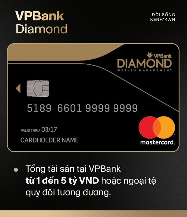 Với các thành viên VPBank Diamond Elite, tổng tài sản tại ngân hàng này phải từ 5 tỷ VND trở lên hoặc ngoại tệ quy đổi tương đương. Một cách khác để trở thành khách hàng ưu tiên ở nhóm này là số dư trên tài khoản thanh toán trung bình tháng tại VPBank từ 500 triệu VND trở lên (hoặc ngoại tệ quy đổi tương đương).