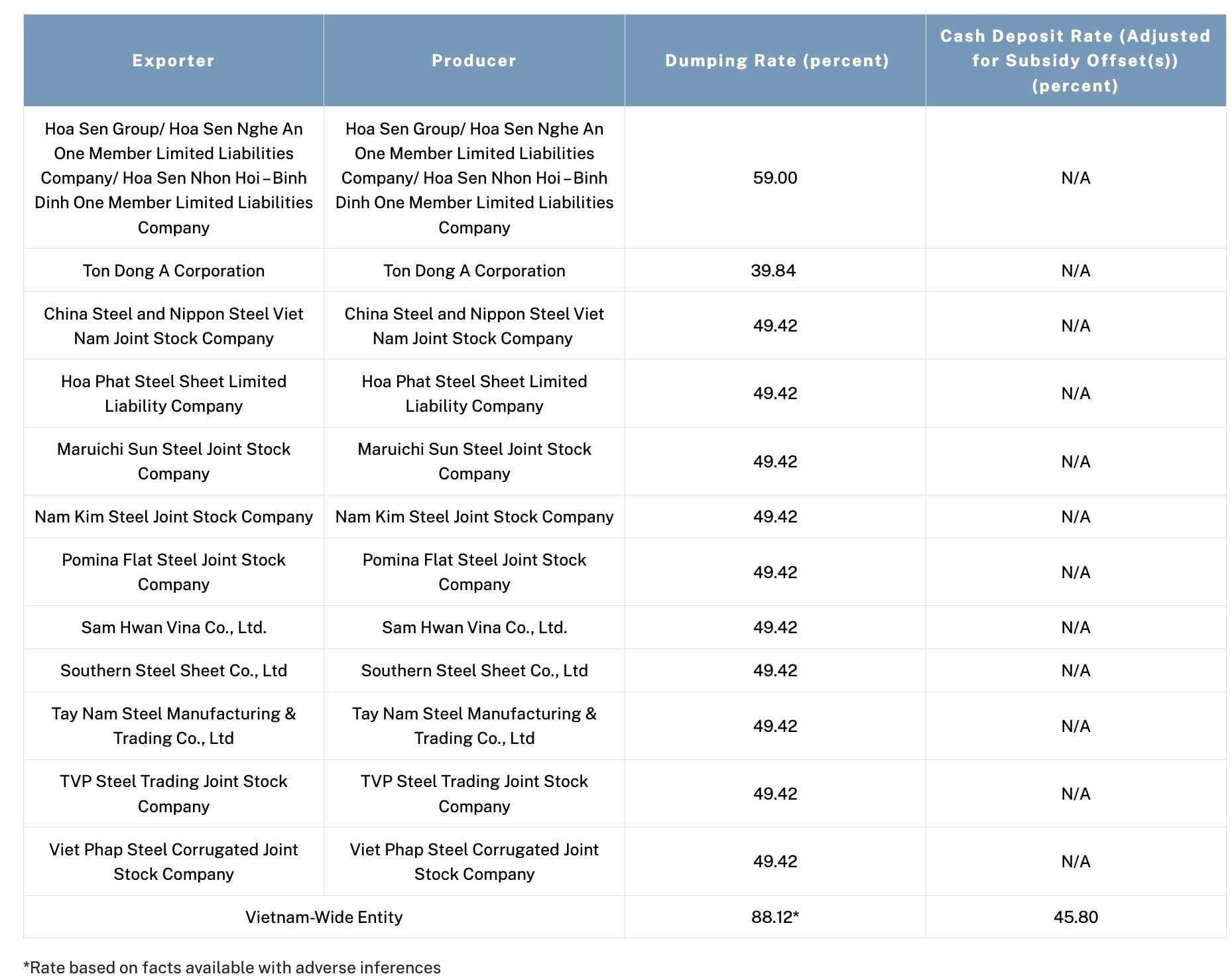 Cụ thể, Tập đoàn Hoa Sen (mã HSG) tỷ lệ bán phá giá cao nhất là 59%, Tôn Đông Á (mã GDA) bị áp mức 39,84%. Các doanh nghiệp khác như China Steel & Nippon Steel Việt Nam, Công ty Tôn Hoà Phát (thuộc Tập đoàn Hoà Phát, mã HPG), Thép Nam Kim (mã NKG) ở mức 49,42%.