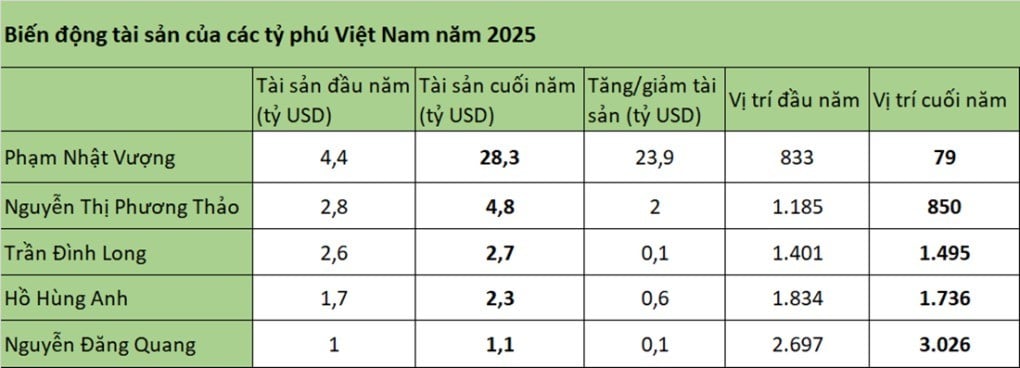 Trong năm qua, ông Trần Đình Long và ông Hồ Hùng Anh cũng ghi nhận mức tăng tài sản lên tới hàng trăm triệu USD. Riêng ông Nguyễn Đăng Quang, Chủ tịch Masan Group, từng bị Forbes loại khỏi danh sách vào tháng 3 nhưng đã quay trở lại chỉ sau ba tháng. Kết thúc năm 2025, tài sản của ông cũng tăng thêm khoảng 100 triệu USD.