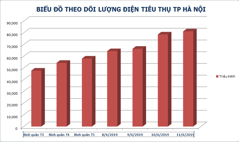 Do nhu cầu sử dụng các thiết bị làm mát của nhân dân tăng cao dẫn đến lượng điện tiêu thụ trên địa bàn Thủ đô cũng tăng đột biến. Theo thống kê hàng ngày của TCty Điện lực Hà Nội (EVN HANOI), ngày 11.6 sản lượng điện tiêu thụ trên toàn thành phố đã lên tới mức 81,256 triệu kWh (cao nhất kể từ đầu năm 2019).