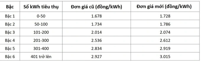 Từ ngày 4/5, bảng giá điện sinh hoạt cũng tăng 3% với mức thấp nhất là 1.728 đồng/kWh, cao nhất 3.015 đồng/kWh tăng lần lượt 50-88 đồng/kWh so với giá cũ. Giá điện tăng kết hợp với nắng nóng kéo dài khiến nhiều người dự báo hóa đơn tiền điện tháng 5 có thể còn tăng mạnh hơn.