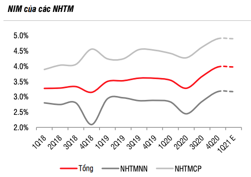 Việc lãi suất cho vay đã giảm từ 1 - 1,5% chậm hơn mức giảm của lãi suất tiền gửi (2 - 2,5%) trong năm 2020, đã khiến biên lãi ròng (NIM) của hầu hết các ngân hàng thương mại đã tăng rất mạnh trong nửa cuối năm 2020 và hiện ở mức cao lịch sử, khoảng 4%.