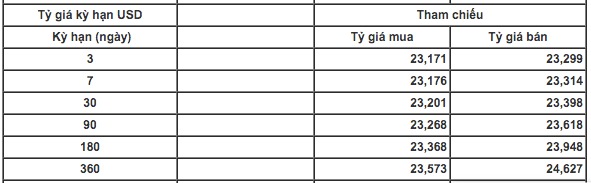 Tại kỳ hạn 360 ngày, giá USD đang là 23.573 - 24.627 VND/USD, tăng 19 đồng chiều mua vào và tăng 20 đồng chiều bán ra so với sáng qua.