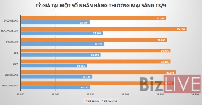 Trước đó, trong phiên ngày 12/9, Ngân hàng Nhà nước niêm yết tỷ giá trung tâm ở mức 23.138 VND/USD, tăng 8 đồng so với phiên trước đó. Tỷ giá bán được niêm yết ở mức 23.782 VND/USD.