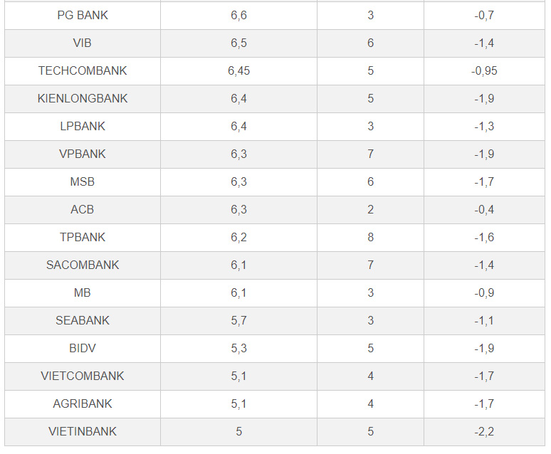 Những ngân hàng đã 5 lần giảm lãi suất trong 3 tháng qua gồm: GPBank, Saigonbank, VietA Bank, Techcombank, KienLong Bank, BIDV, và VietinBank.